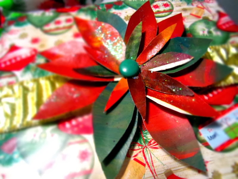This one is made from my Mom's discarded watercolor projects. You know what they say...."Another man's trash (or mama's)...." I am putting them on packages. I apologize right now to all those family members who received their packages unadorned. I was inspired by this project after I delivered your presents. You know who you are. I owe you a trash flower. Maybe next year.